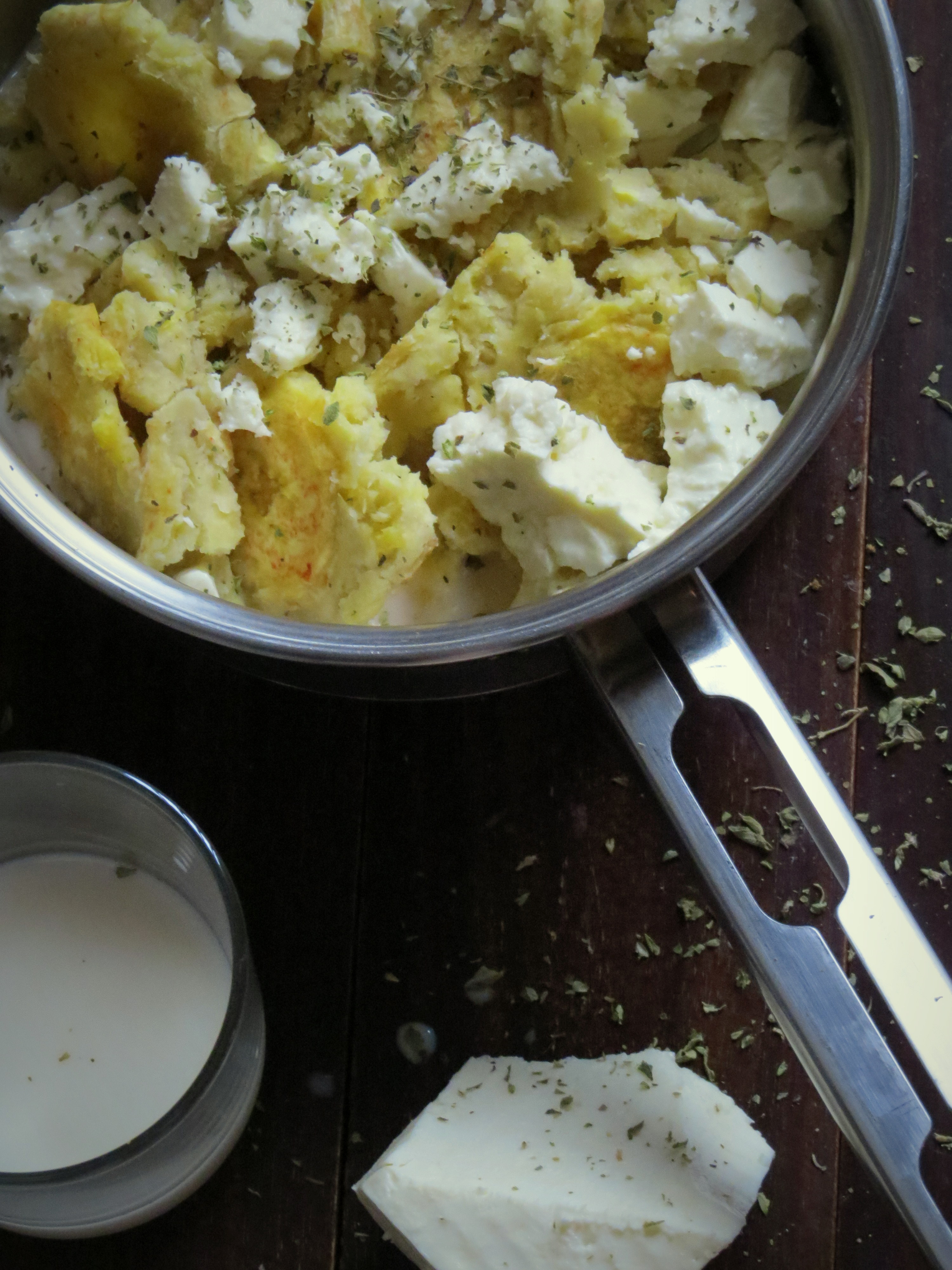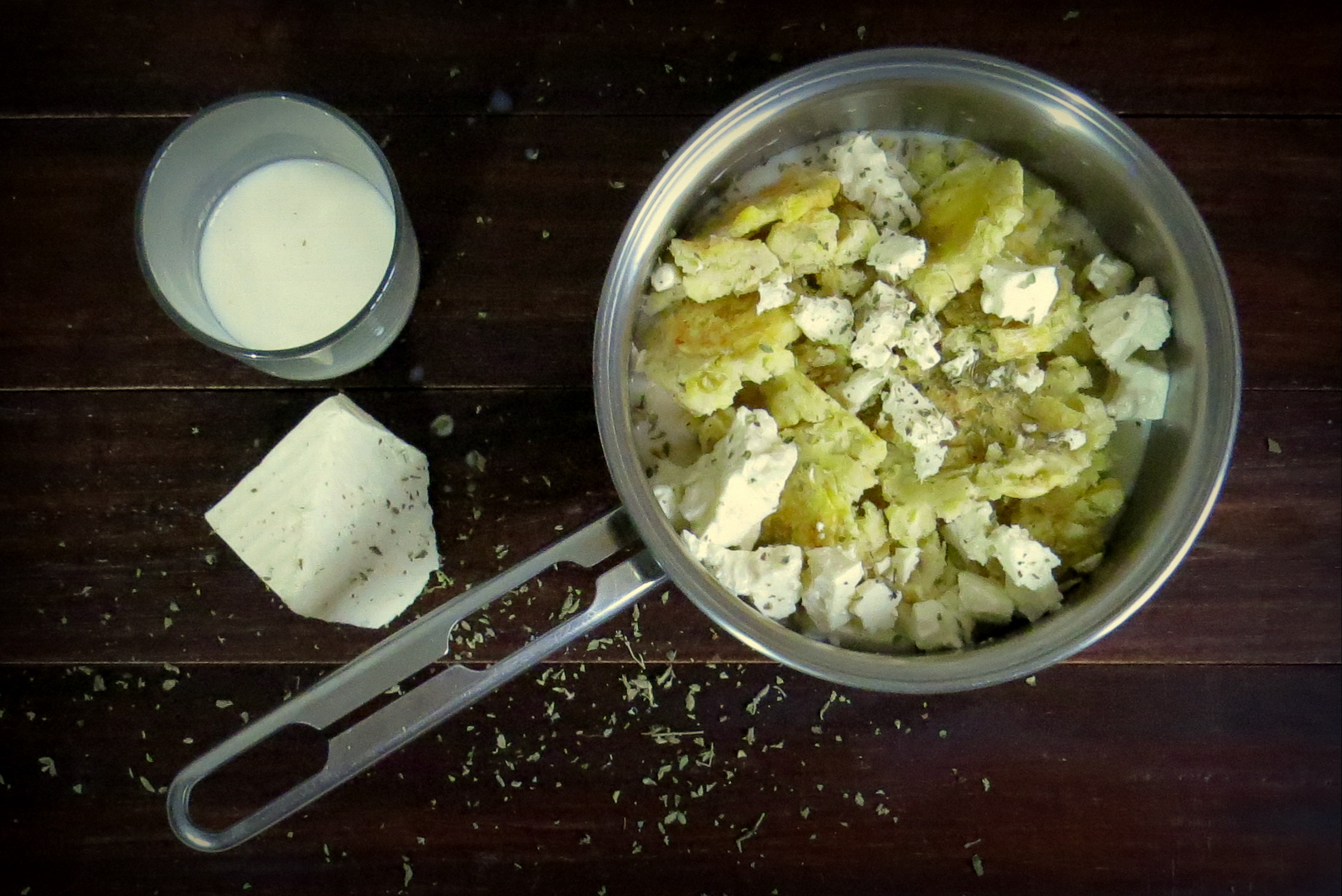 Coloca en una olla o cacerola el verde aplastado, la leche, el queso troceado y el orégano. Poner a cocinar y cuando empiece a hervir, agregar mantequilla y sal al gusto.