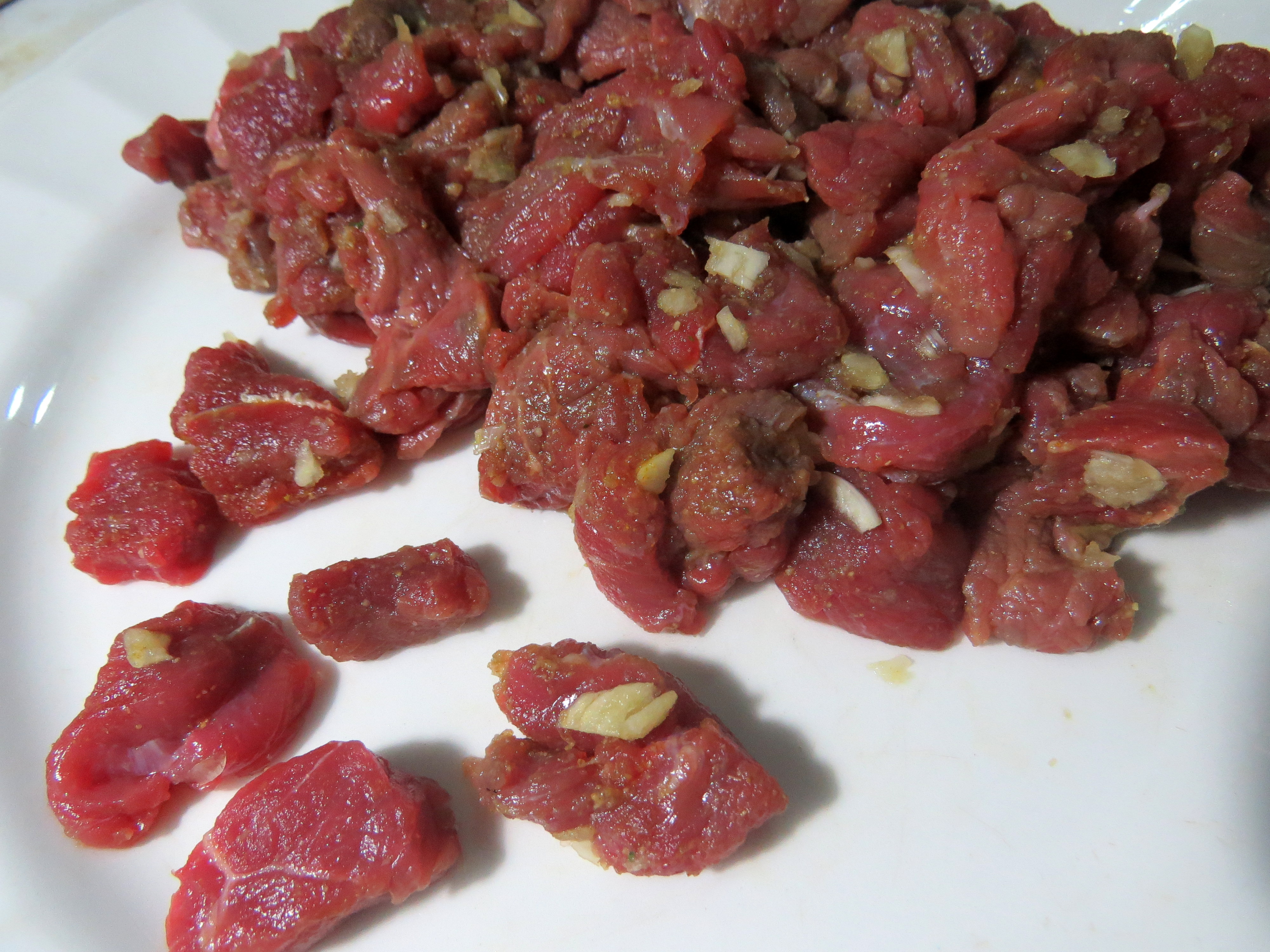 Cortar la carne en cubos pequeños y aliñarla al gusto.